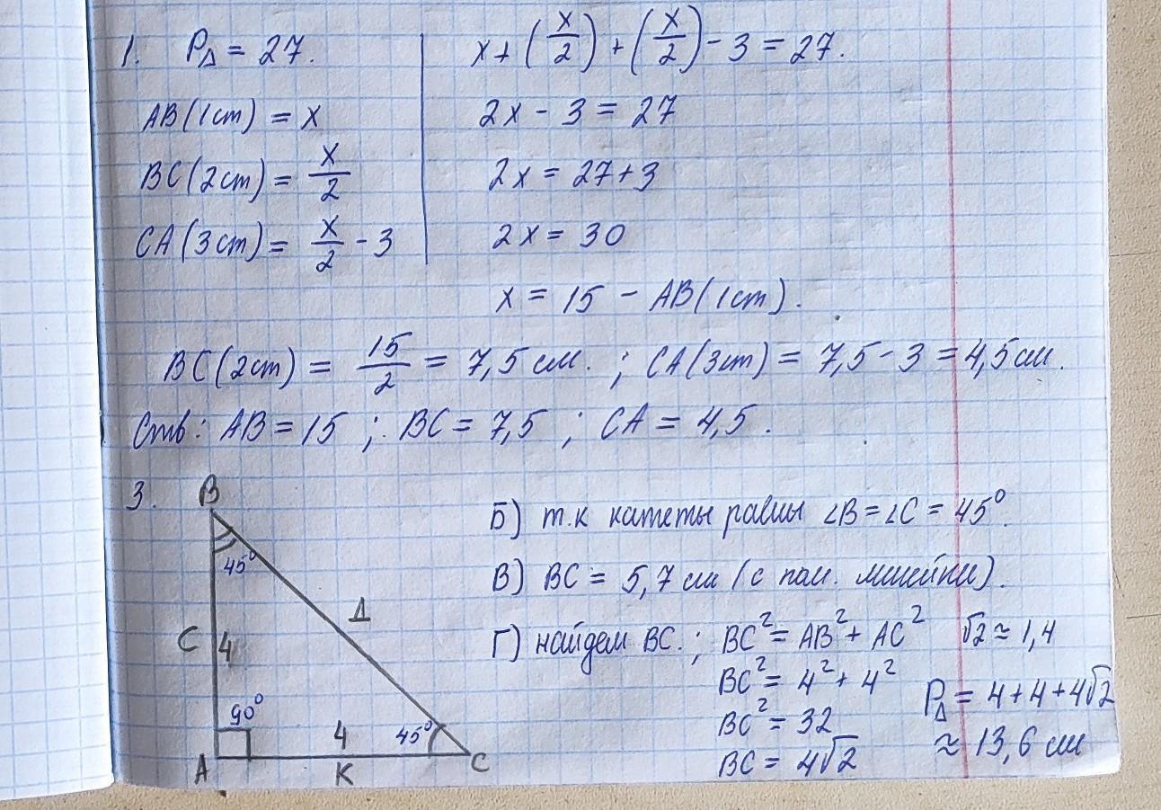 Периметр треугольника равен 27. Одна его стенка в два раза короче другой, а третья ребро на 3 см короче второго ребра. Длины стенок треугольника стада.
