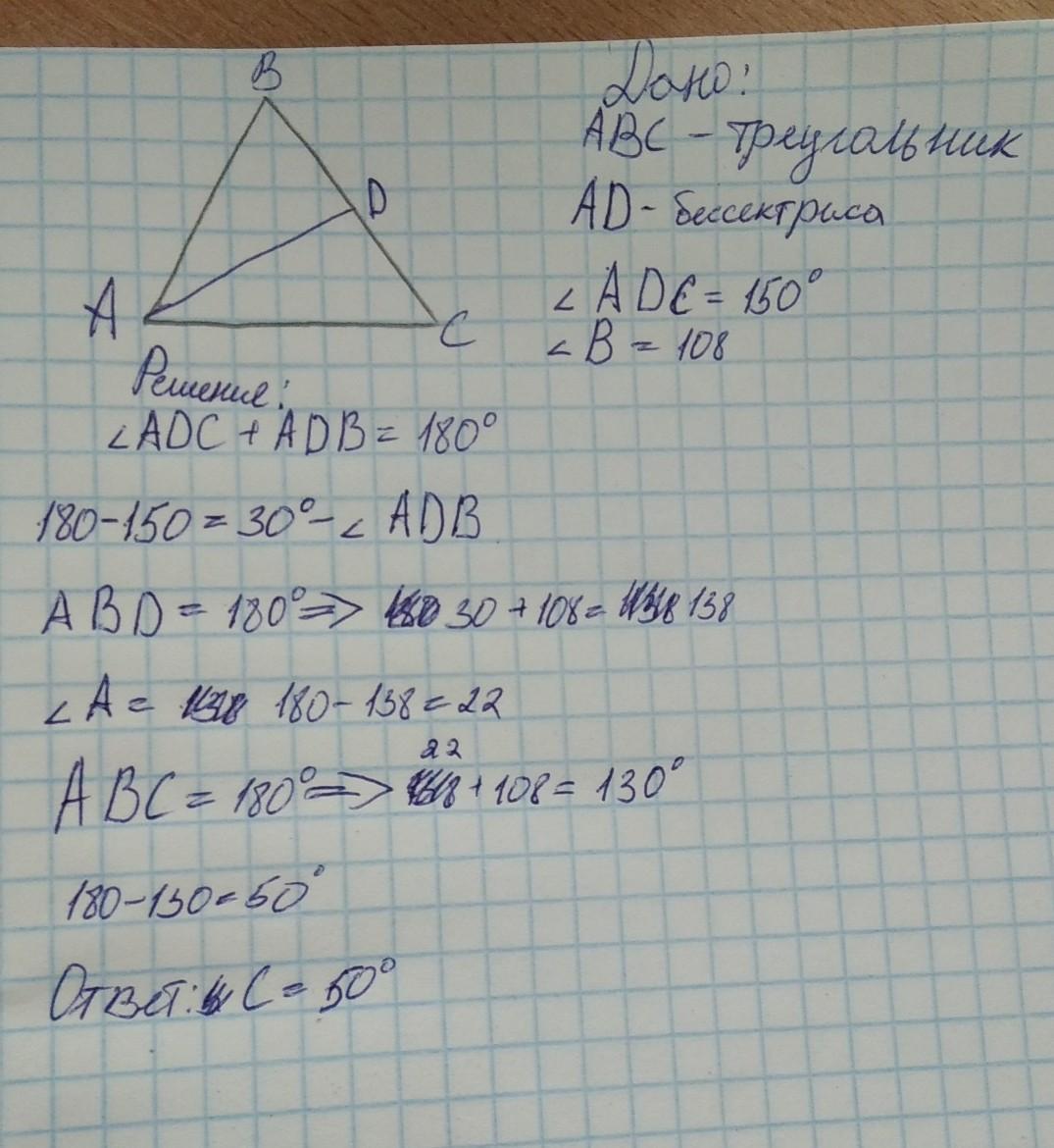 AD биссектриса в треугольнике ABC найдите угол C если угол ADC равен 150 градусов угол B равен 108 градусов ответ дайте в градусов ПОЛНОЕ РЕШЕНИЕ!