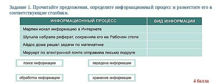 Задание 1. Прочитайте предложения, определите информационный процесс и разместите его в соответствующие столбики.