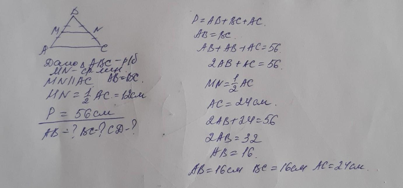 Средняя линия равнобедренного треугольника параллельна основанию и равна 12см. Найдите стороны треугольника, если его периметр равен 56 см.