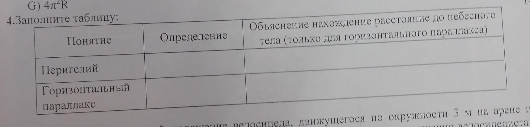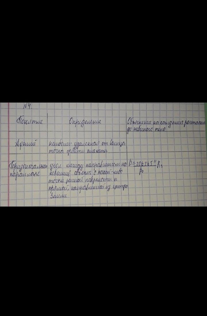 4.Заполните таблицу: Понятие Определение Объяснение нахождение расстояние до небесного тела (только для горизонтального параллакса) Перигелий Горизонтальный параллакс