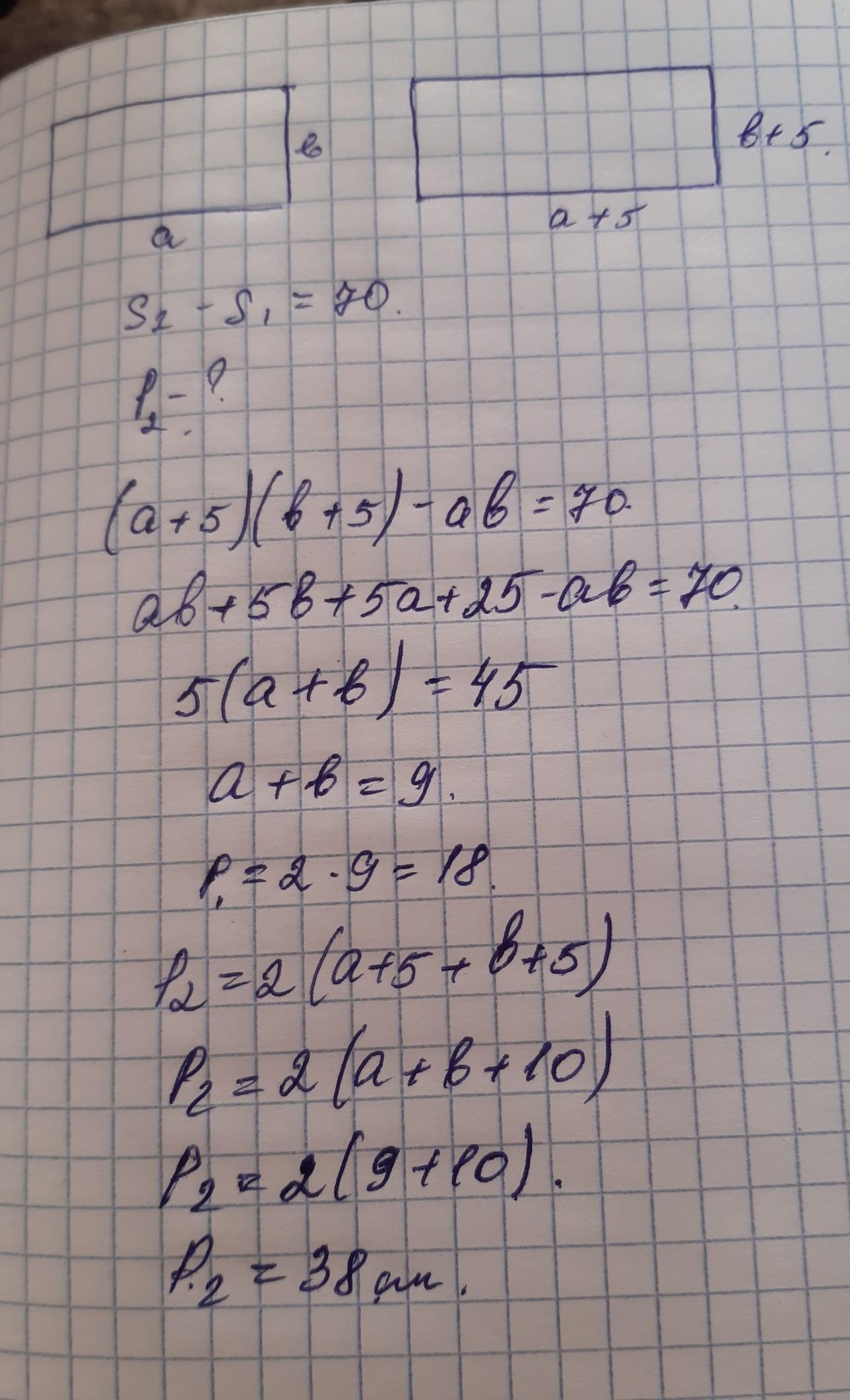 На листе нарисованы два прямоугольника. Известно, что и длина, и ширина второго прямоугольника на 5 см больше, чем длина и ширина первого, а площадь второго прямоугольника на 70 см2 больше площади первого. Найдите периметр второго прямоугольника