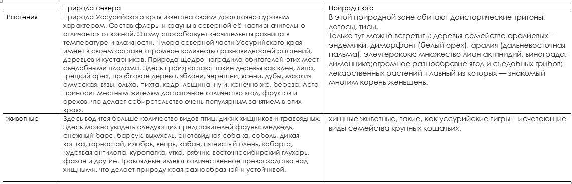 Заполните таблицу Природа Уссурийского края Природа севера: растения животные Природа юга : растения животные