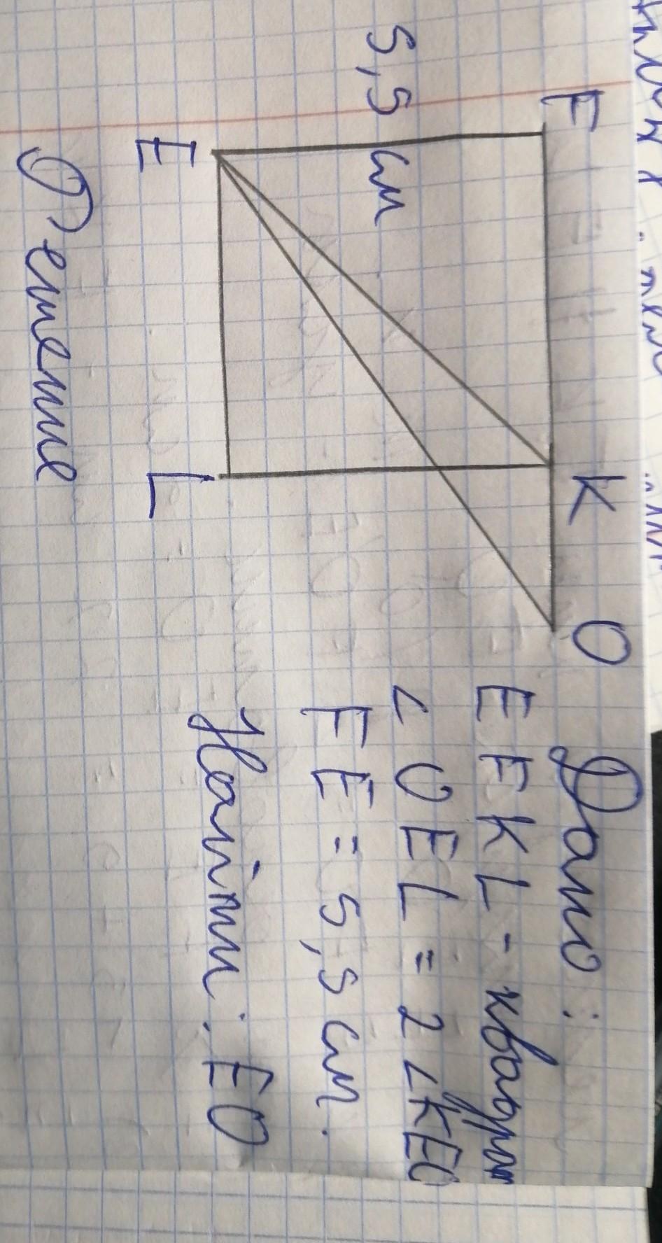 В квадрате EFKL на продолжении стороны FК за точку K отметили точку O так, что угол OEL в два раза больше угла KEO. Найди отрезок EO, если сторона квадрата равна 5,5 см