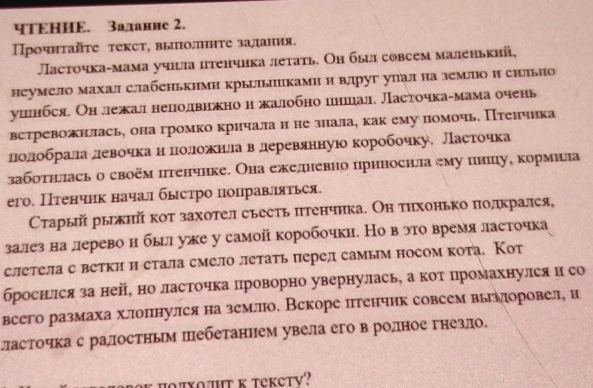 6. Кто и как помог упавшему тенчику? 7. Какую роль играет мама-ласточка? Приведите два примера из текста. 8. Сформулируйте два вопроса по содержанию текста.