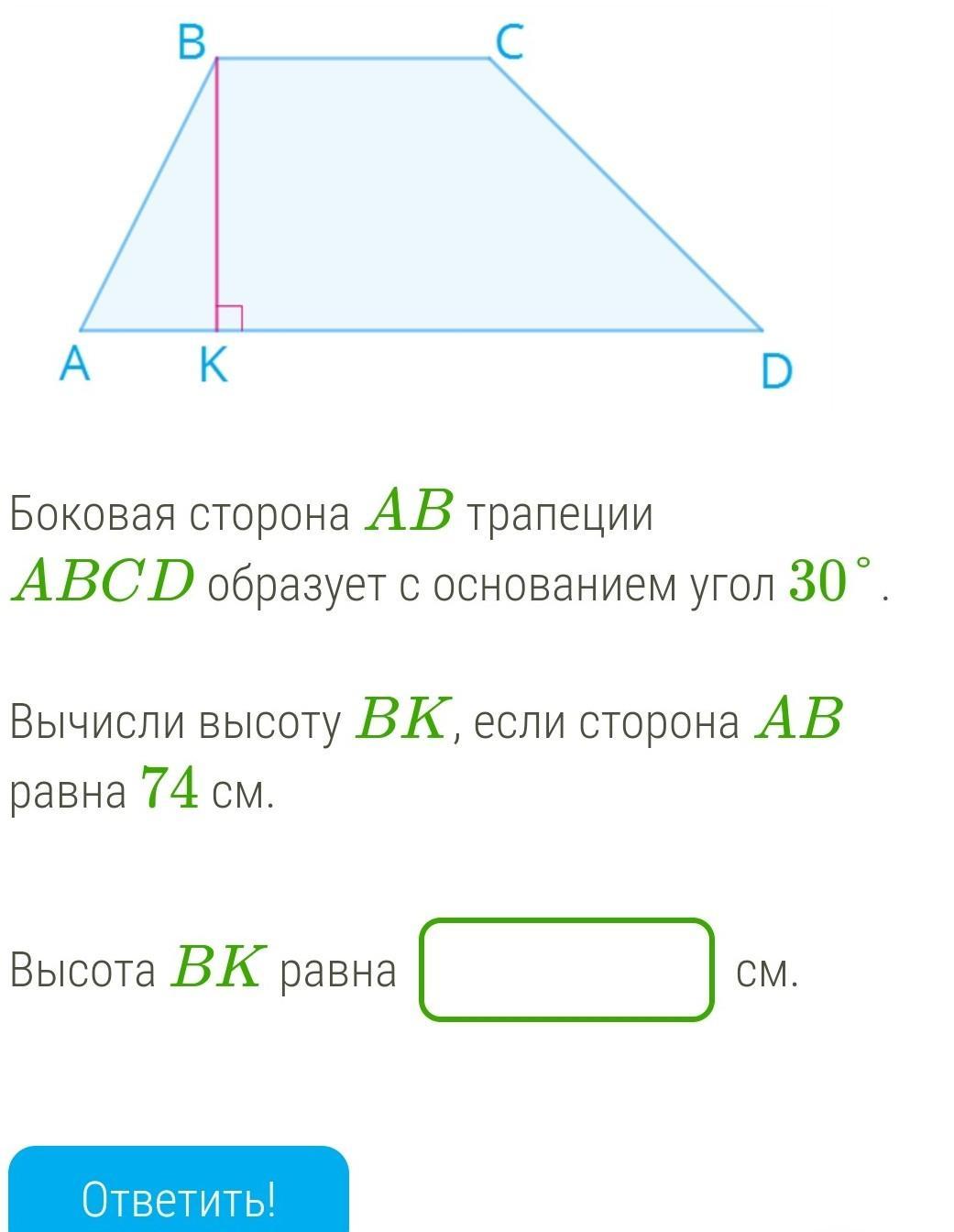 Боковая сторона AB трапеции ABCD образует с основанием угол 30°. Вычисли высоту BK, если сторона