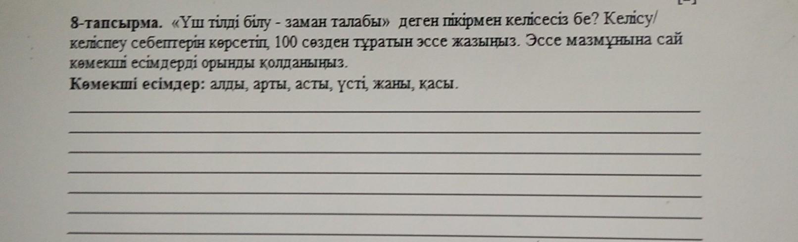 8-тапсырма. «Үш тілді білу – заман талабы» деген пікірмен келісесіз бе? Келісу/ келіспеу себептерін көрсетіп, 100 сөзден тұратын эссе жазыныз. Эссе мазмұнына сай көмекші есімдерді орынды қолданыңыз. Көмекші есімдер: алды, арты, асты, үсті жаны, қасы.
