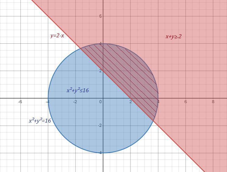 Найдите множество точек координатной плоскости , которое задано системой неравенства : {x^2+y^2≤16 {x+y≥2