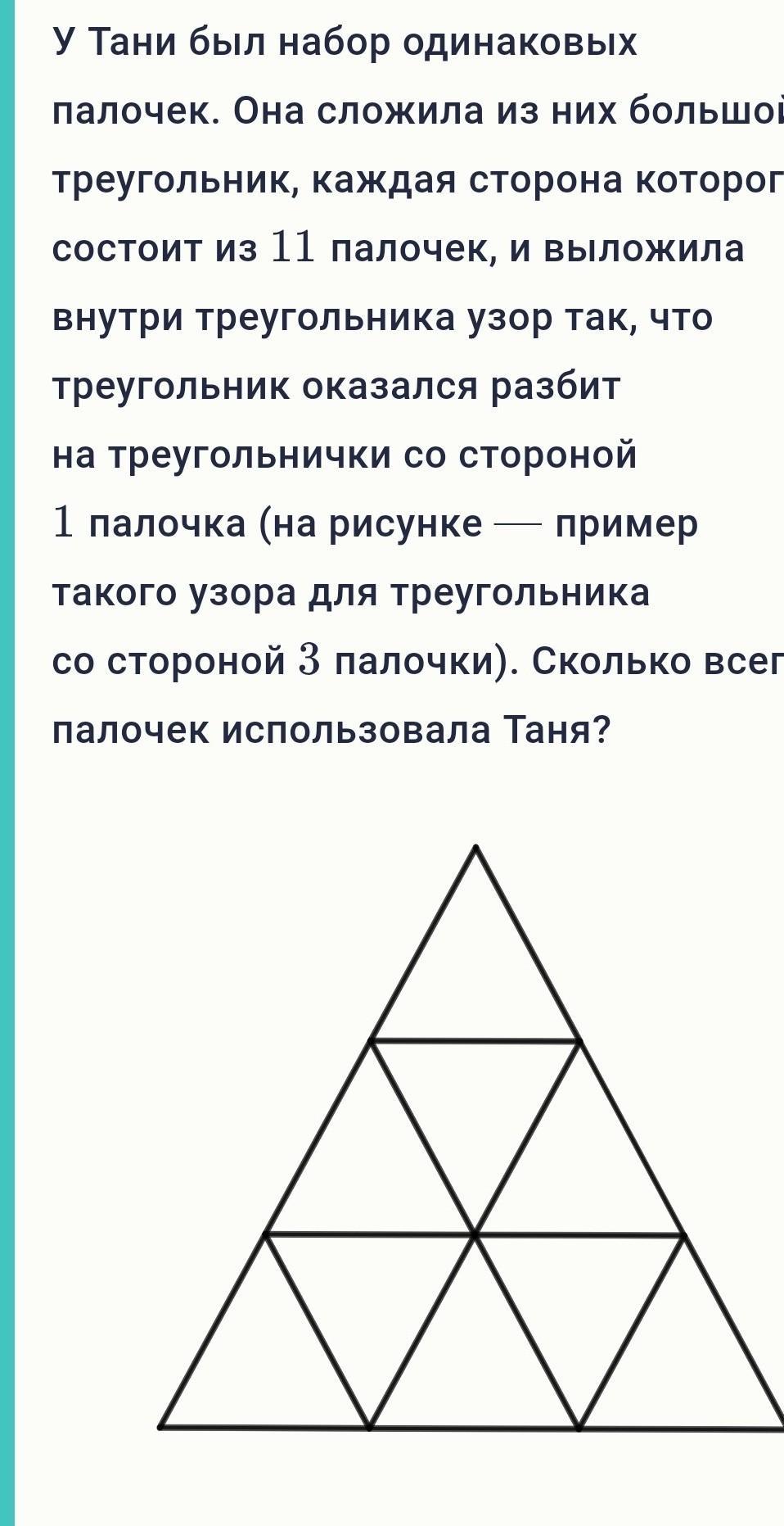 Пошаговое объяснение: короче если внизу 11 палочек то чтобы доделать треугольника понадобится