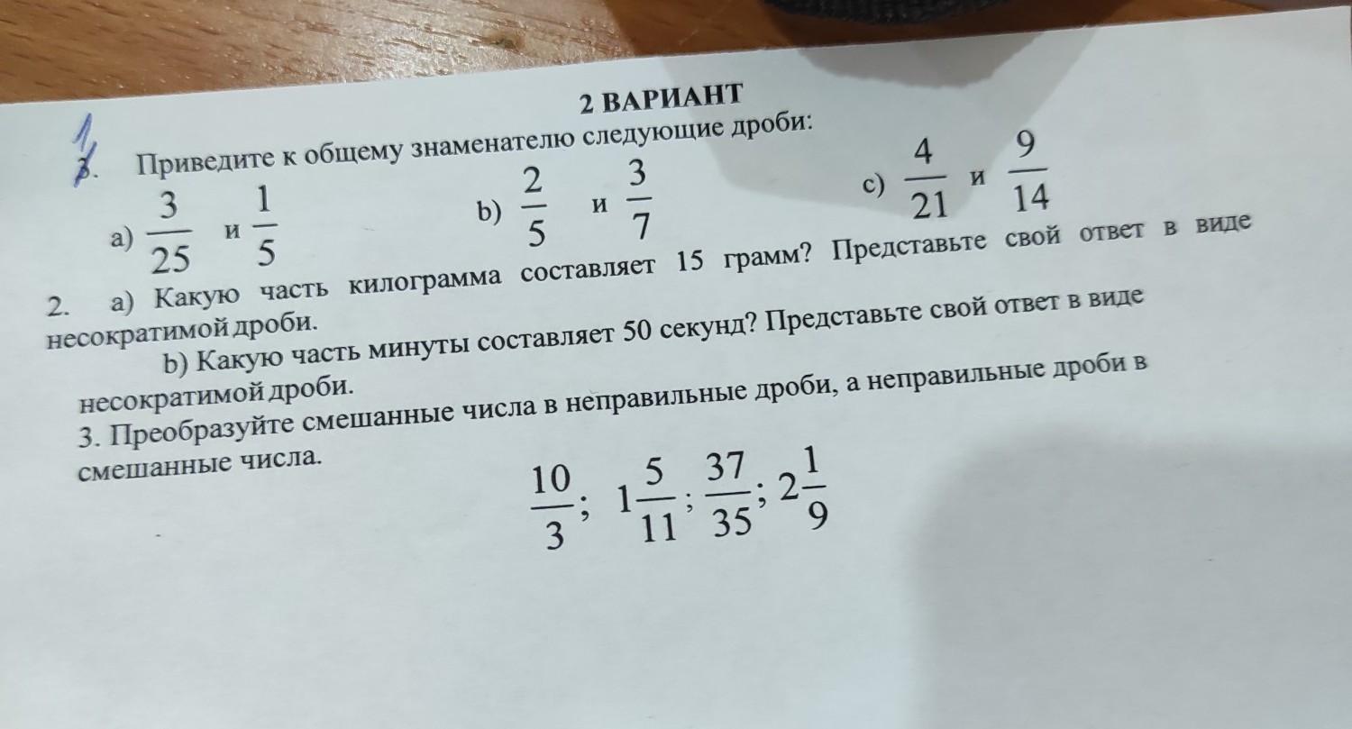 a) и - и с) И 2 ВАРИАНТ Приведите к общему знаменателю следующие дроби: 3 1 2 3 4 9 b) 25 5 5 7. 21 14 а) Какую часть килограмма составляет 15 грамм? Представьте свой ответ в виде есократимой дроби. b) Какую часть минуты составляет 50 секунд? Представьте свой ответ в виде несократимой дроби. 3. Преобразуйте смешанные числа в неправильные дроби, а неправильные дроби в смешанные числа. 10. 5 5 37 1 10 35 9 2 3