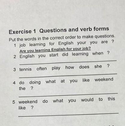 Exercise 1 Questions and verb forms Put the words in the corect rder to make ouestions 1 job learning for English your you are ? Are you leaming Enolish for vo job? 12 English you start did leaming when ? 3 lennis often play how does she ? do doing what at you like weokend the ? 5 weekend do what you would to this ike ? 5