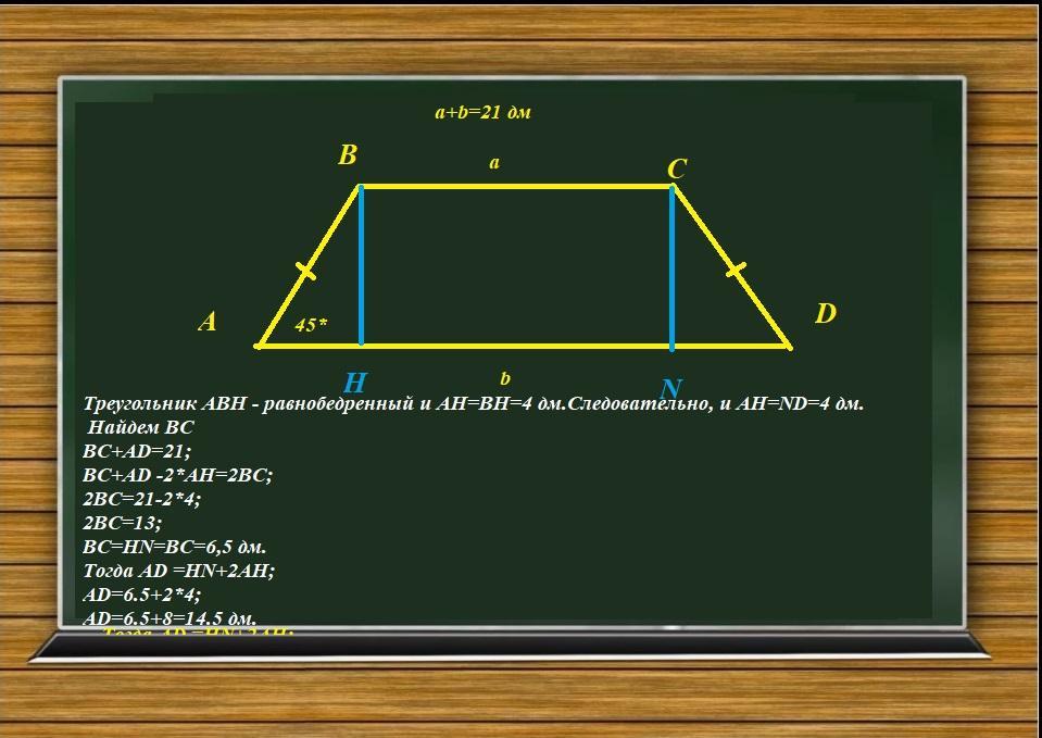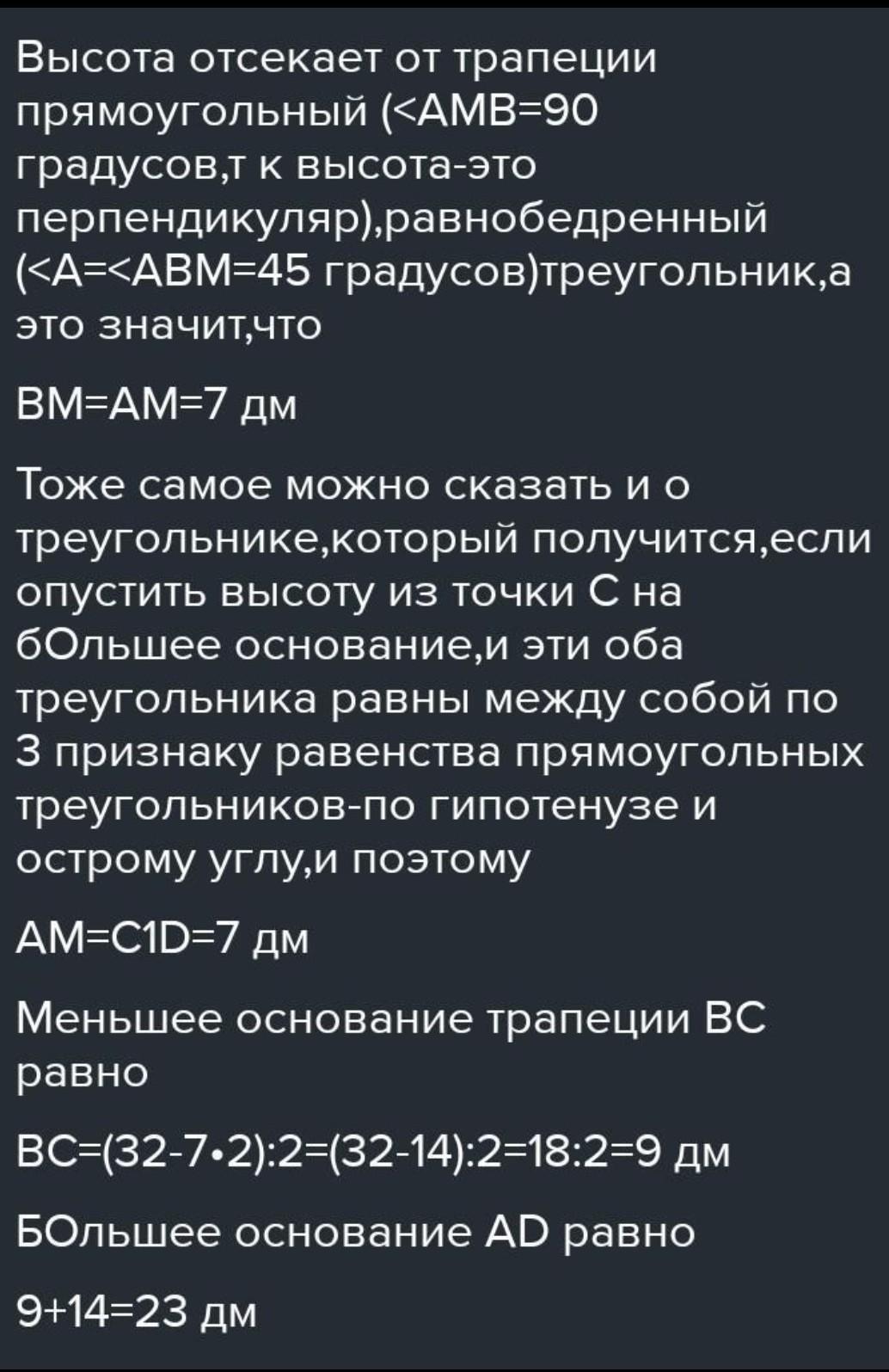 3. Острый угол равнобедренной трален равен 45°, высота - 4 дм, а сумма оснований 21 дм. Найдите длины оснований трапеции. Помогите пожалуйста ,срочно
