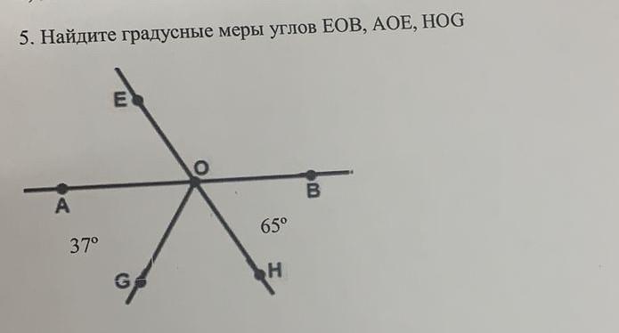 Объяснение: аое=65° тк углы аое и вон вертикальные и равны, еов=180°-65°=115°, тк он смежный с углом аое, гон=180°-37°-65°=78°