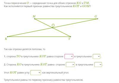 1. сторона TO в треугольнике KOT равна стороне MO в треугольнике MOG