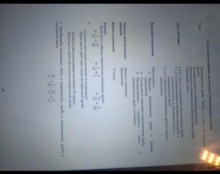 Суммативнос оценивание за раздел «Обыкновенные дроби» Тема Обыкновенная дробь. Чтение и запись обыкновенных дробей Основное свойство обыкновенной дроби Правильные и неправильные обыкновенные дроби Смешанные числа Цель обучения 5.5.2.1 Читать и записывать обыкновенные дроби 5.1.2, 13 Преобразовывать неправильную дробь в смешанное число и смешанное число в неправильную дробь 5.1.2.15 Приводить обыкновенные дроби к новому знаменателю Критерийі оценивания K Обучающийся Приводит обыкновенные дроби общему знаменателно Составляет и записывает обыкновеннуо дробь Преобразовывает смешанное Число неправильную дробь, и наоборот . B Уровень мыслительных навыков Знание и понимание Применение Время выполнения 15 минут Задания 1. Приведите к общему знаменателю следующие дроби: 3 13 5 а) 22 66 16 24 40 2. а) Какую часть метри составляет 8 дециметров? Представьте свой ответ в виде несократимой дроби. ын c) b) Какую часть килограмма составляет 45 грамм? Представьте свой ответ в виде несократимой дроби. 3. Преобразуйте смешанные числа в неправильные дроби, а неправильные дроби в смешанные числа, 3 35 9 2 : 5 8 16 14 15 10