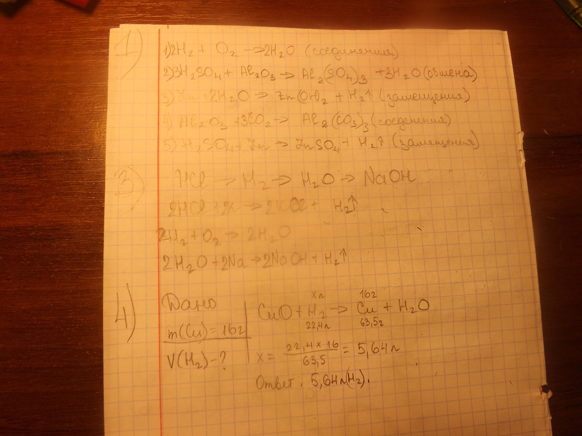 4. Определите объем водорода,который требуется для восстановления 16г меди из оксида меди 2