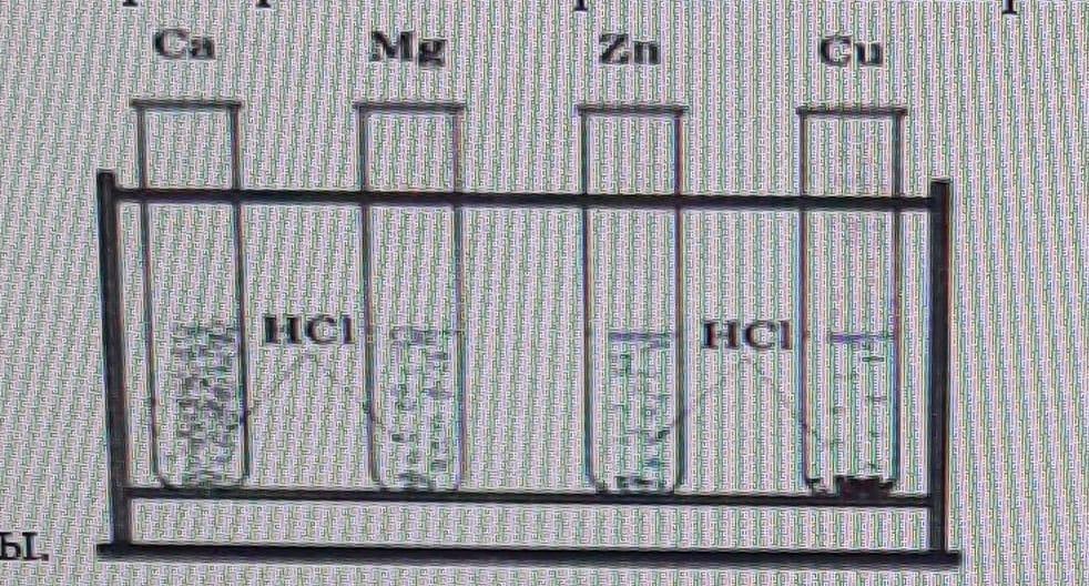 В четыре одинаковые пробирки налили равные объёмы раствора соляной кислоты и поместили в них разные металлы.