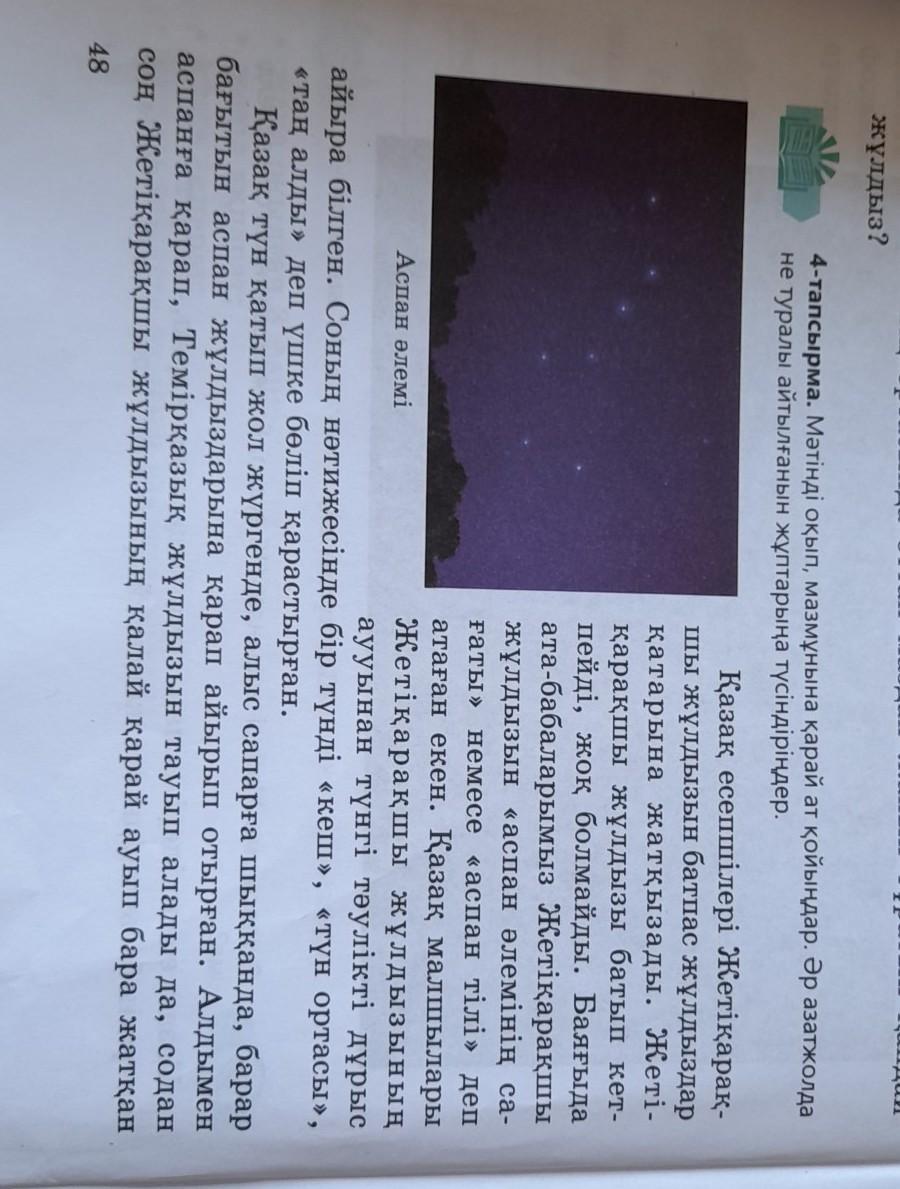 4-тапсырма. Мәтінді оқып, мазмұнына қарай ат қойындар. Әр азатжолда не туралы айтылганын жұптарына тусiндiрiндер. Казак есепшілері Жетiкарак шы жулдызын батпас жулдыздар катарына жаткызады. Жеті каракшы жулдызы батып кет пейдi, жок болмайды. Баягыда ата-бабаларымыз Жетіқарақшы жулдызын аспан әлемiнiн са гаты» немесе аспан тілі деп атаған екен. Қазак