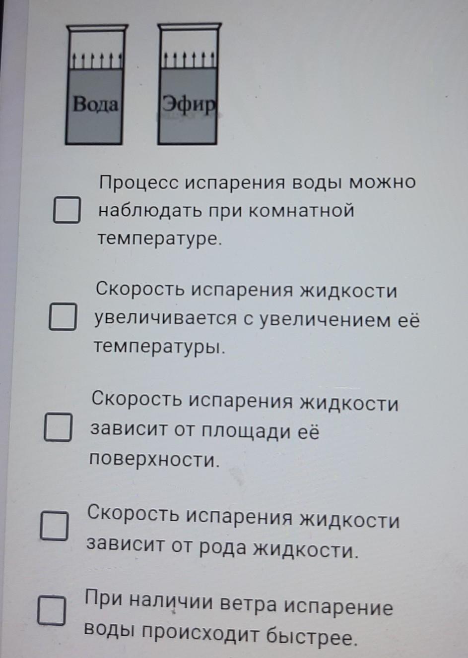 в 2 одинаковых цилиндрических сосуда налили равное количество воды и эфира находящихся при комнатной температуре (см.рис.) в результате наблюдений было отмечено что Эфир испарился в несколько раз быстрее чем вода Выберите из предложенного перечня два утверждения которые соответствуют результатам проведённых экспериментальных наблюдений и укажите их номера.