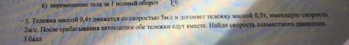 v=(m1*v1+m2*v2)/(m1+m2)=(400*5+500*2)/(400+500)≈3.3 м/с