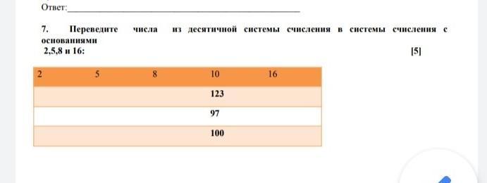 7. Переведите и десятичной системы счисления в системы счисления с числа основаниями 2,5,8 и 16: