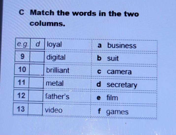 C Match the words in the two columns. a business e.g. d loyal 9 digital b suit 10 brilliant C camera 11 metal d secretary 12 father's e film 13 video f games