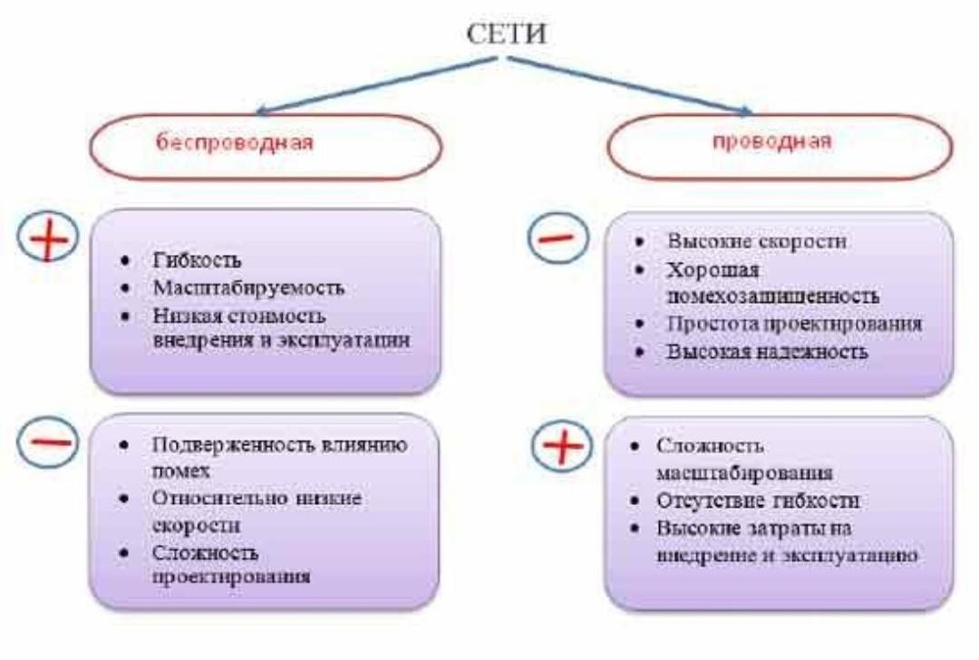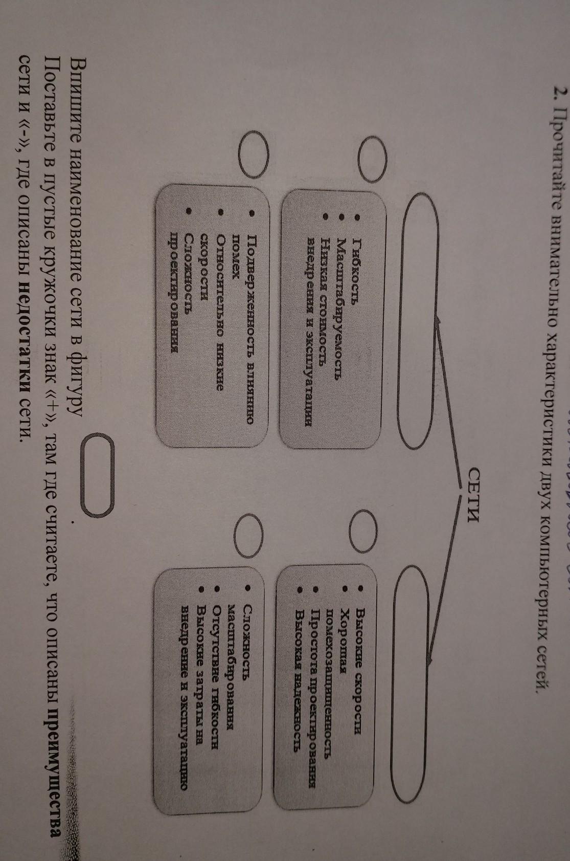 2. Прочитайте внимательно характеристики двух компьютерных сетей. СЕТИ О Гибкость Масштабируемость Низкая стоимость внедрения и эксплуатации Высокие скорости Хорошая помехозащищенность Простота проектирования Высокая надежность о Подверженность влиянию помех относительно низкие скорости Сложность проектирования Сложность масштабирования Отсутствие гибкости Высокие затраты на внедрение и эксплуатацию Впишите наименование сети в фигуру Поставьте в пустые кружочки знак «+», там где считаете, что описаны преимущества сети и «-», где описаны недостатки сети.