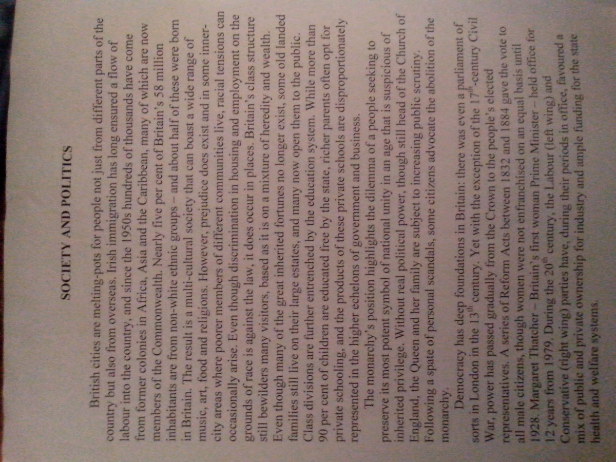 1.Британских городов фрезерно-сообщение для людей, и не только из разных уголков страны, но также из-за рубежа. Ирландской иммиграции уже давно обеспечили приток рабочей силы в стране, и с 1950-х годов сотни тысяч пришли из бывших колоний в Африке, Азии и Карибского бассейна, многие из которых сейчас являются членами Содружества. Почти на пять процентов в Великобритании 58 млн жителей из не-белого этнических групп - и около половины из них родились в Британии. Результатом является мульти - культурного общества, которые могут похвастаться широким спектром музыки, искусства, пищевой и религий. Однако, ущерба не существует и в некоторых городских районах, где более бедные члены различных общин жить, расовой напряженности иногда возникают. Хотя дискриминации в области жилья и занятости по признаку расы-это против закона, оно имеет место в тех местах. В Великобритании классовой структуры по-прежнему ставит в тупик многих посетителей, поскольку она основана на смеси наследственности и богатства. Хотя многие великие унаследовал судьбу больше не существует, некоторые старые приземлился семей все еще живут в больших поместьях, и сейчас многие из них открыты для публики. Классовые различия еще более закрепляются системы образования. В то время как более 90 процентов детей получают образование бесплатно за счет государства, богатые родители часто выбирают обучение в частной школе, и продукция этих частная школа непропорционально представлены в высших эшелонах власти и бизнеса.
