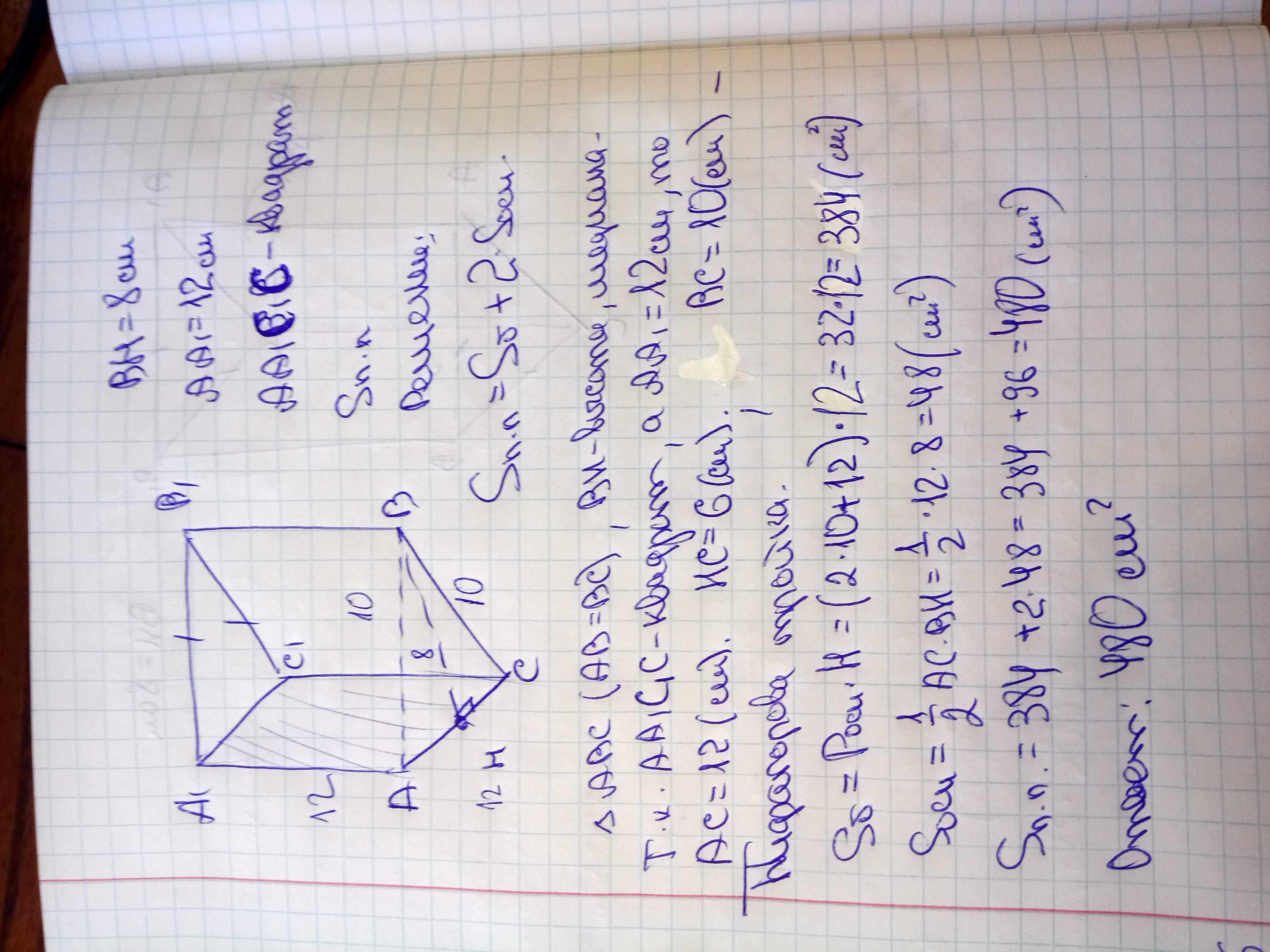 2. Основа прямой призмы - равнобедренный треугольник, высота которого, проведенная к основанию, равна 8 см. Высота призмы равна 12 см. Найдите полную поверхность призмы, если боковая грань, содержит основание треугольника - квадрат.