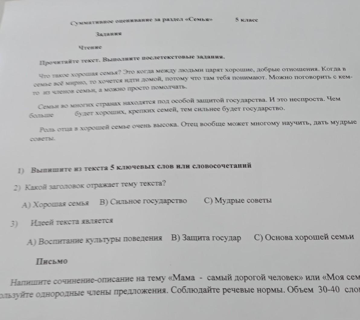 Суммативное оценивание за раздел «Семья» 5 класс Задання Чтение Прочитайте текст. Выполните послетекстовые задания. Что такое хорошая семья? Это когда между людьми царят хорошие, добрые отношения. Когда в семье всё мирно, то хочется идти домой, потому что там тебя понимают. Можно поговорить с кем- то из членов семьи, а модно просто помолчать. Семьи во многих странах находятся под особой защитой государства. И это неспроста. Чем больше будет хороших, крепких семей, тем сильнее будет государство. Роль отца в хорошей семье очень высока. Отец вообще может многому научить, дать мудрые советы. 1) Выпишите из текста 5 ключевых слов или словосочетаний 2) Какой заголовок отражает тему текста? А) Хорошая семья В) Сильное государство C) Мудрые советы 3) Идеей текста является A) Воспитание культуры поведения В) Защита государ C) Основа хорошей семьи Письмо Напишите сочинение-описание на тему «Мама - самый дорогой человек» или «Моя семья». Используйте однородные члены предложения. Соблюдайте речевые нормы. Объем 30-40 слов. помогите пожалуйста