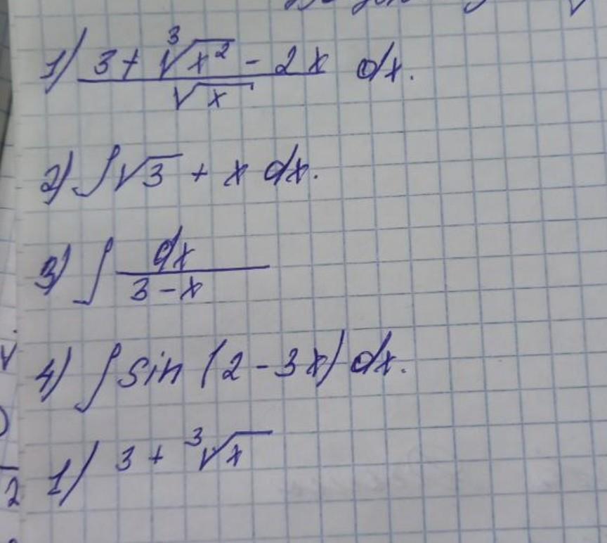 1) ∫(3+∛x)dx=3x+∫x¹/³dx=3x+(3/4)*x⁴/³+c=3x+(3/4)*x*∛x+c