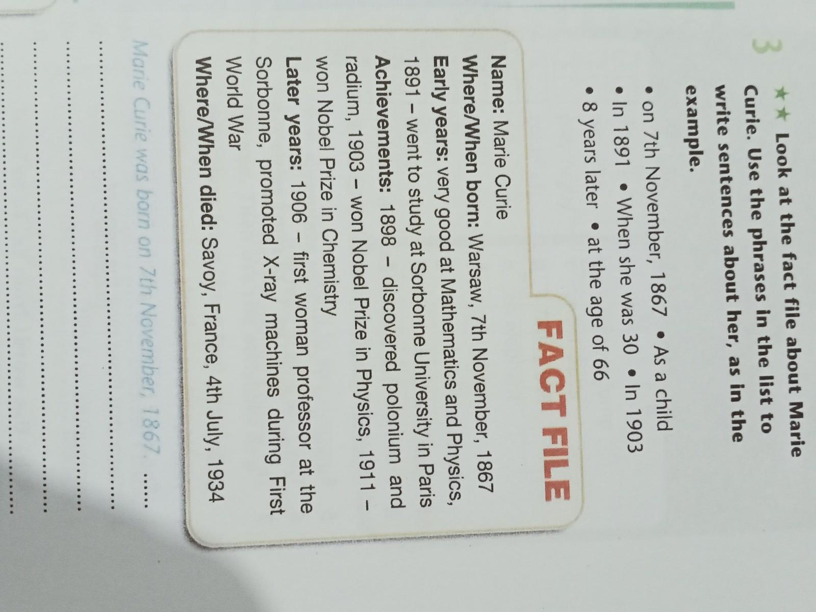 3 ** Look at the fact file about Marie Curie. Use the phrases in the list to write sentences about her, as in the example. • on 7th November, 1867 • As a child • In 1891 • When she was 30 . In 1903 • 8 years later • at the age of 66 FACT FILE