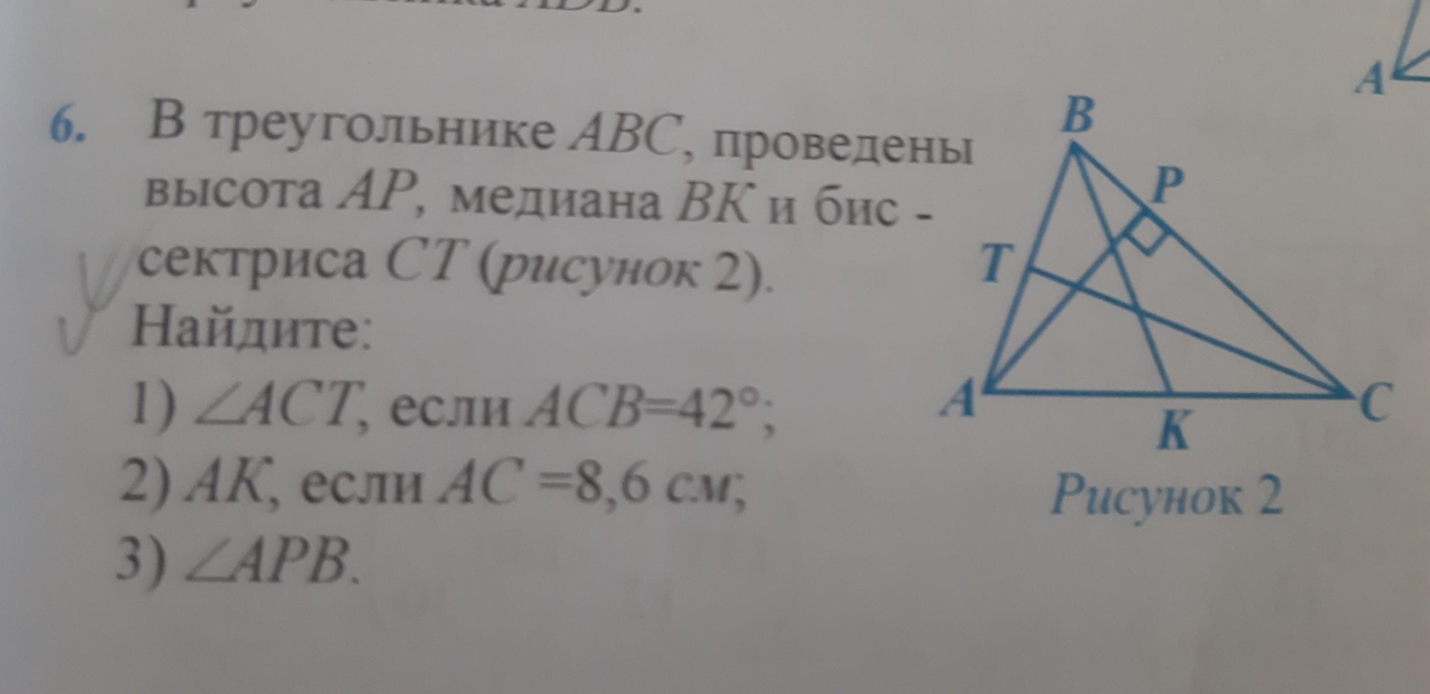 В треугольнике ABC, проведены высота AP, медиана ВК и биссектриса СТ (рисунок 2). Найдите:
