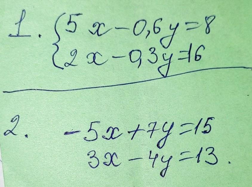 1) 2-е уравнение * на(-2), {5x-0,6y=8 u {-4x+0,6y=-32, сложим их, получим, х= -24, подставим в 1-е, 5*(-24)-0,6y=8, -0,6y=8+120,