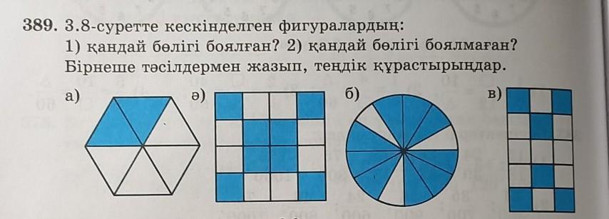 389. 3.8-суретте кескінделген фигуралардың: 1) қандай бөлігі боялған? 2) қандай бөлігі боялмаған? Бірнеше тәсілдермен жазып, теңдік құрастырыңдар. a) ә) в) 6)