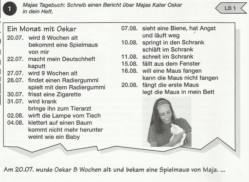 Дневник Майи: Напишите в блокноте отчет о коте Майи, Оскаре. Месяц с Оскаром 07.08. видит пчелу, пугается и убегает 08.10. прыгает в туалете спит в туалете 20.07. исполняется 8 недель 22 июля я получаю игрушечную мышку. делает мою немецкую книгу 11.08. кричит 15.08 Вываливается разбитое окно 27.07. будет 9 недель 28.07. находит ластик играет с ластиком 08/16. хочу поймать мышь не могу поймать мышь 20.08. ловит первую мышь кладет мышь в мою кровать 7/30. кушает сигарету 31.07. заболеет отвезти его к ветеринару 02.08. сбрасывает лампу со стола 04.08. залезает на дерево, больше не плачет, как младенец, 20 июля. Оскару было 8 недель, и Майя подарила ему игрушечную мышку
