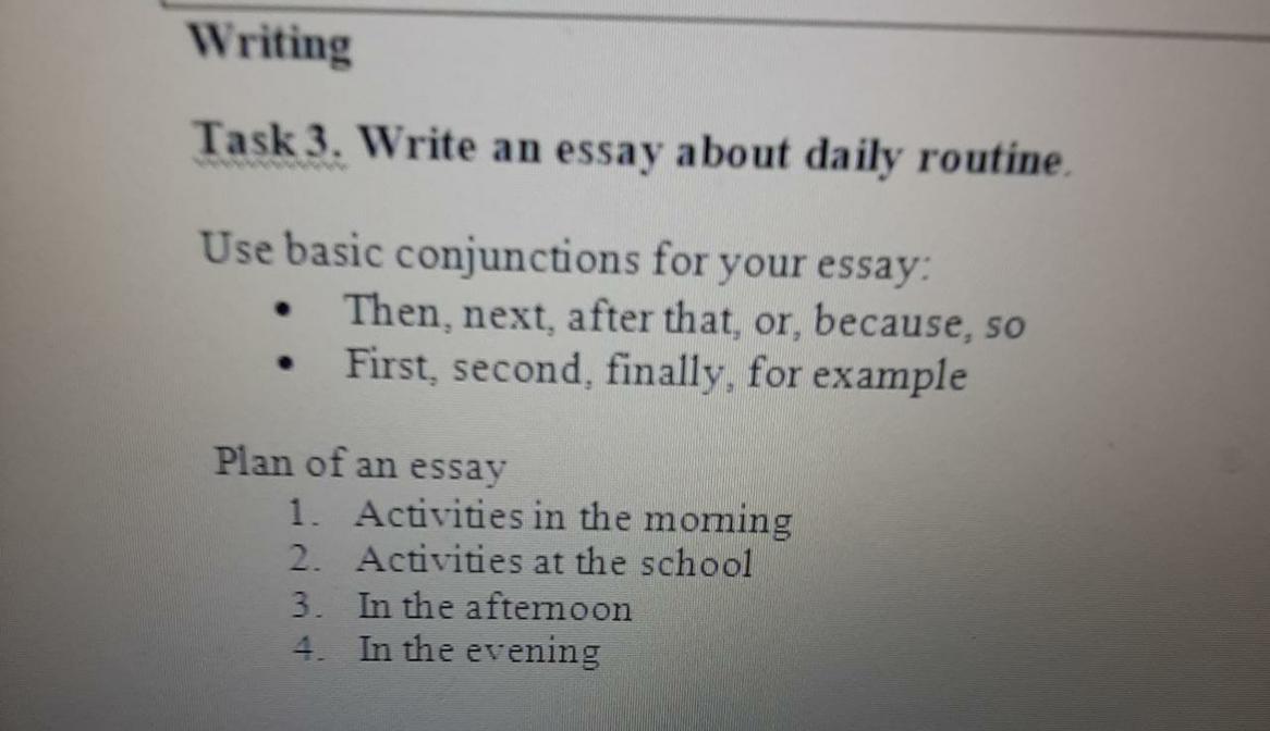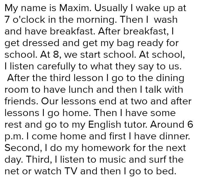 First thing I do after walking up is stretching. And after that, the second thing I do is bruising my teeth. I'm on Jerry to get ready for school because time in a morning runs too fast. So you have to catch up to be in school on time. In school, I participate in all activities. For example, I participate in basketball team. When clocks hit afternoon, time goes slowly. It is to become difficult to sustain productivity. Finally, in evening I'm trying to finish all my homework fast, so I can lay in my cozy bed till next morning this routine repeats.