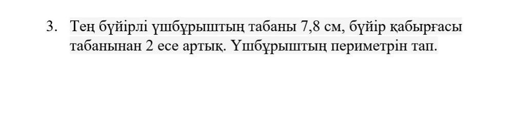 3. Основание равностороннего треугольника 7,8 см, боковая стенка в 2 раза больше основания. Найдите периметр треугольника.