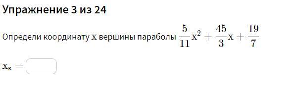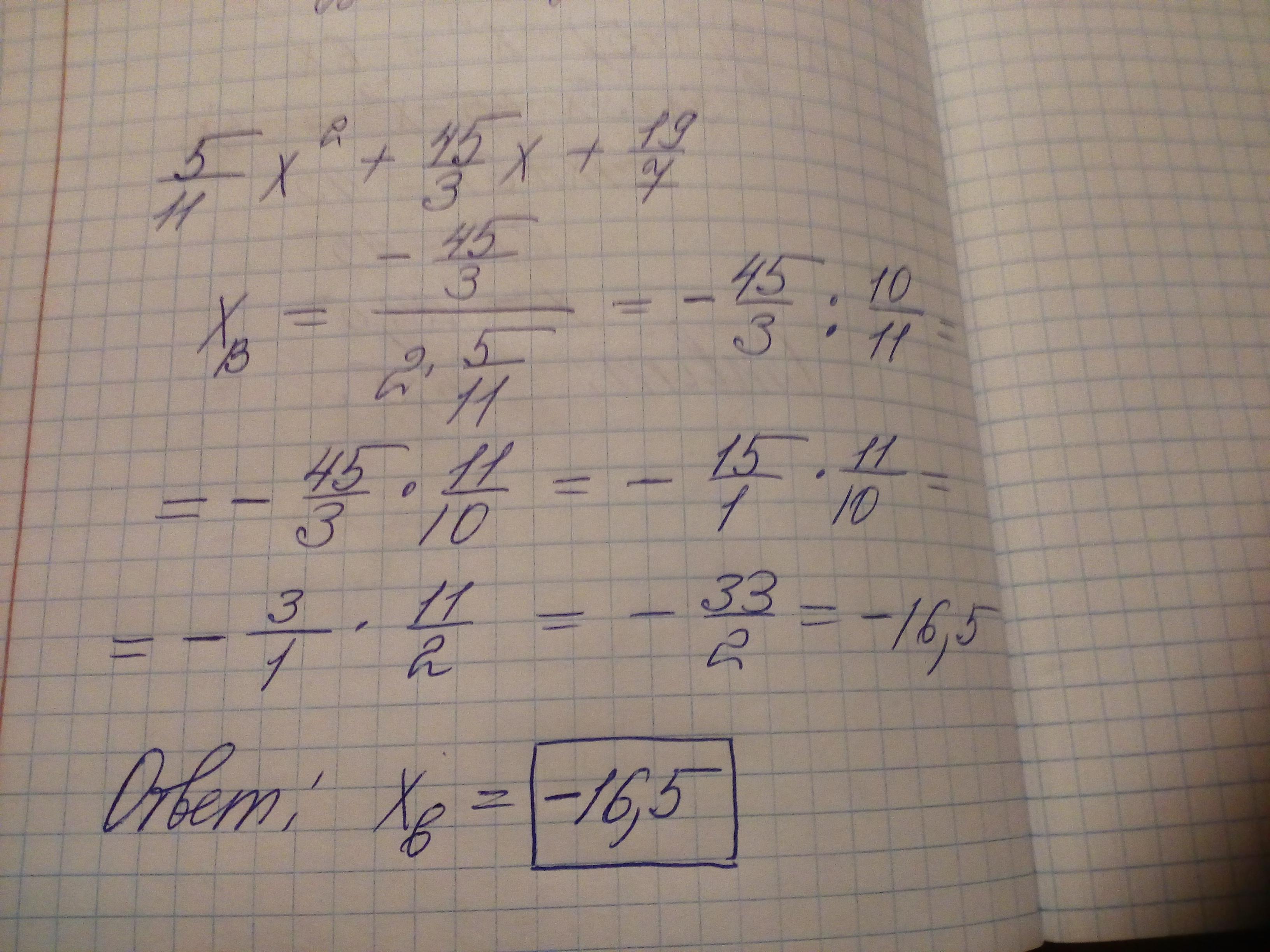 абсцисса вершины параболы вычисляется по формуле -b/2a = -(45/3):(2*(5/11)) = -(45/3):(10/11) = -(45/3)*(11/10) = -(45*11)/(3*10) = -495/30 = -16,5