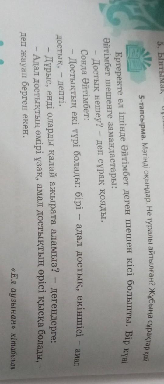 5-тапсырма. Мәтінді оқыңдар. Не туралы айтылған? Жұбыңа сұрақтар қой. Ертеректе ел ішінде Әйтімбет деген шешен кісі болыпты. Бір күні Әйтімбет шешенге замандастары: Достық нешеу? – деп сұрақ қояды. Сонда Әйтімбет: Достықтың екі түрі болады: бірі - адал достық, екіншісі достық, - депті. - Дұрыс, енді оларды қалай ажырата аламыз? дегендерге: - Адал достықтың өмірі ұзақ, амал достықтың өрісі қысқа болады, - деп жауап берген екен. «Ел аузынан» кітабынан
