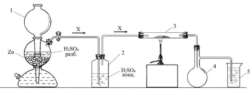 В аппарат Киппа (на рисунке показан цифрой 1) поместили гранулы цинка и залили разбавленную серную кислоту. Выделяющийся газ X пропускали через концентрированную серную кислоту в промывной склянке 2. Затем газ X поступал в трубку 3, в которой находился хлорид металла A. При нагревании протекала реакция между газом X и хлоридом в трубке 3. В результате этой реакции восстанавливался металл A и выделялся газ Y, который вместе с избытком X поступал в предохранительную колбу 4, а затем – в стакан 5 с водой. Газ Y хорошо растворялся в воде, при этом образовалась кислота.