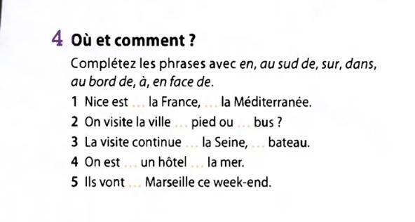 Нужно вставить слова : avec en, au sud de, sur, dans, au bord de, à, en face de.