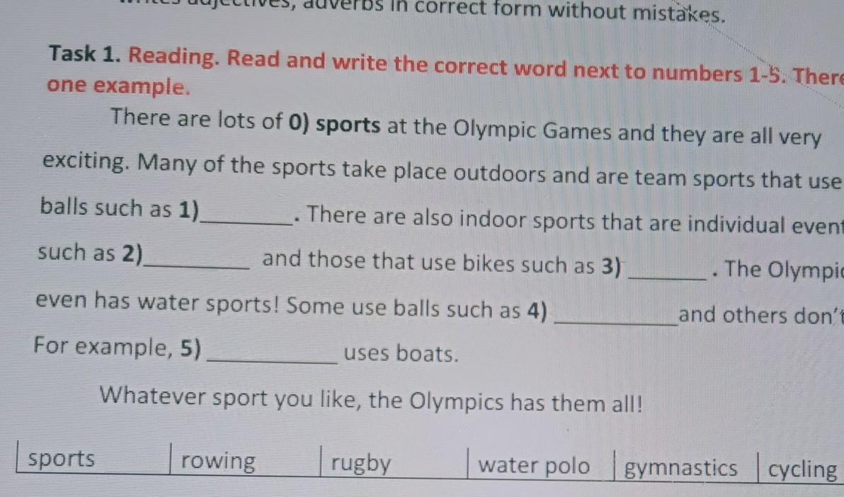 Total points: 10 Descriptor: A learner reads the text and chooses the right variant. writes words correctly writes adjectives, adverbs in correct form without mistakes. Task 1. Reading. Read and write the correct word next to numbers 1-5. There is one example. There are lots of O) sports at the Olympic Games and they are all very exciting. Many of the sports take place outdoors and are team sports that use balls such as 1) There are also indoor sports that are individual events such as 2). and those that use bikes such as 3) . The Olympics and others don't. even has water sports! Some use balls such as 4) For example, 5) uses boats. Whatever sport you like, the Olympics has them all! sports rowing rugby water polo gymnastics cycling