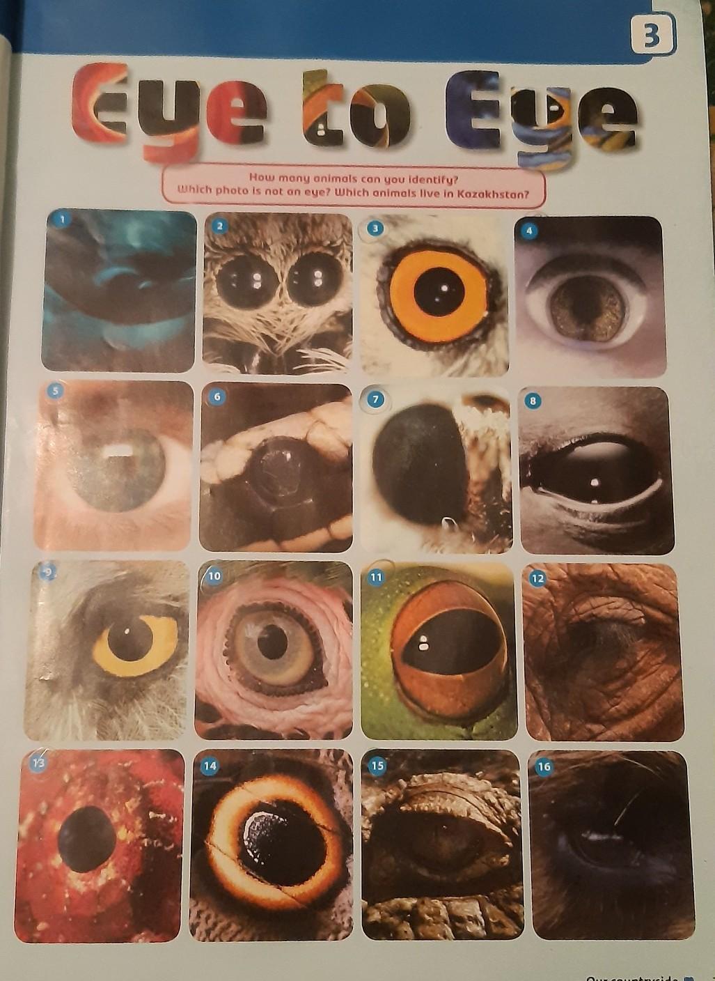 еue to Eye How many animols can you identify? Which photo is not an eye? Which onimols live in Kazakhstan?ответьте на вопросы под надписью eye to eye и напишите глаза каких животных вы видите на картинках