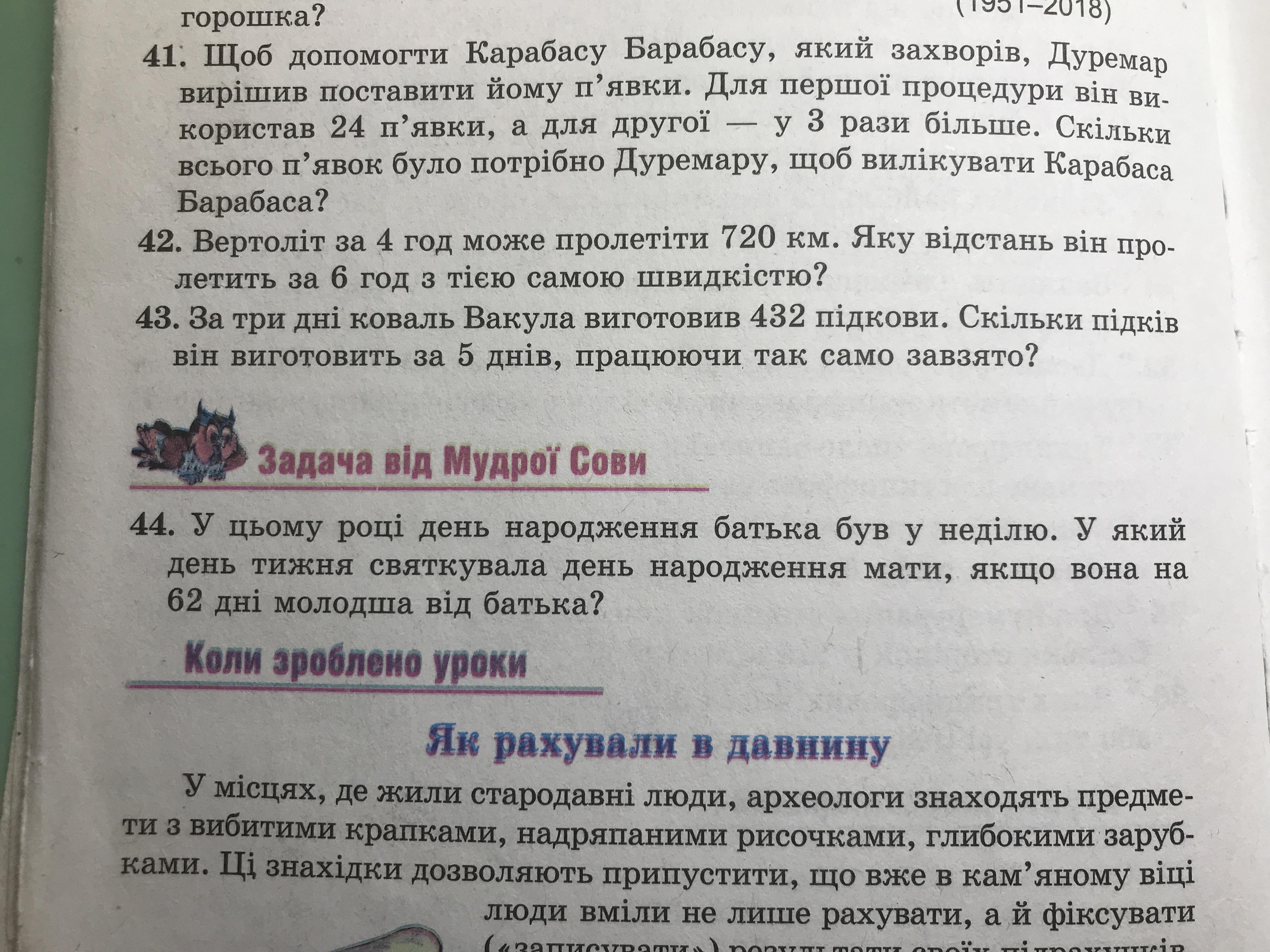 44. У цьому році день народження батька був у неділю. У який день тижня святкувала день народження мати, якщо вона на 62 дні молодша від батька.