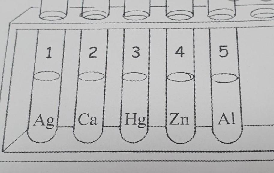 Посмотрите на рисунок. Во все пробирки налит раствор азотной кислоты HNO3. В них поместили металлы. В пробирках под какими номерами будет происходить химическая реакция? Запишите эти реакции.