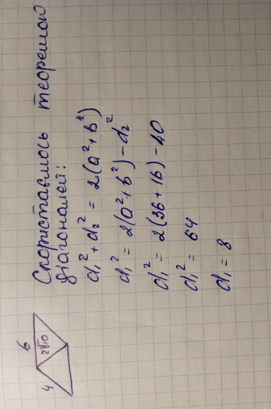 16. Сторони паралелограма дорівнюють 4 см і 6 см. Знайдіть діагональ па- ралелограма, якщо його друга діагональ становить 2✓10 см.