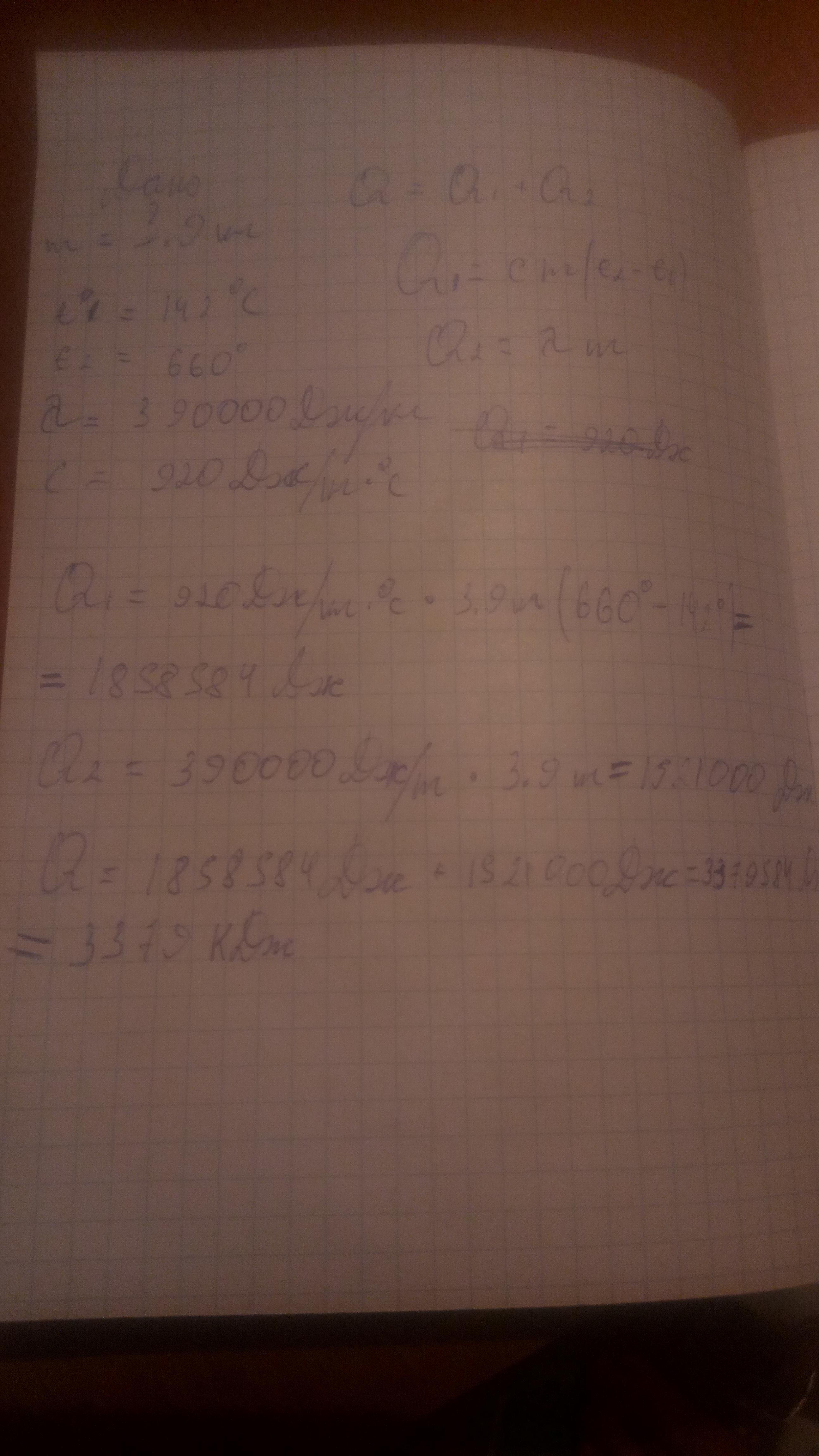 Сколько энергии необходимо затратить, чтобы расплавить алюминий массой 3,9 кг, взятого при начальной температуре 142 °С. Температура плавления алюминия равна 660 °С, удельная теплота плавления алюминия 3,9⋅105 Джкг, удельная теплоёмкость алюминия 920 Джкг⋅°С.
