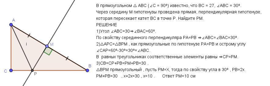 В прямоугольном треугольнике ABC (угол C = 90o) известно, что BC = 27, угол ABC = 30o. Через середину М гипотенузы проведена прямая, перпендикулярная гипотенузе, которая пересекает катет ВС в точке Р. Найдите РМ.