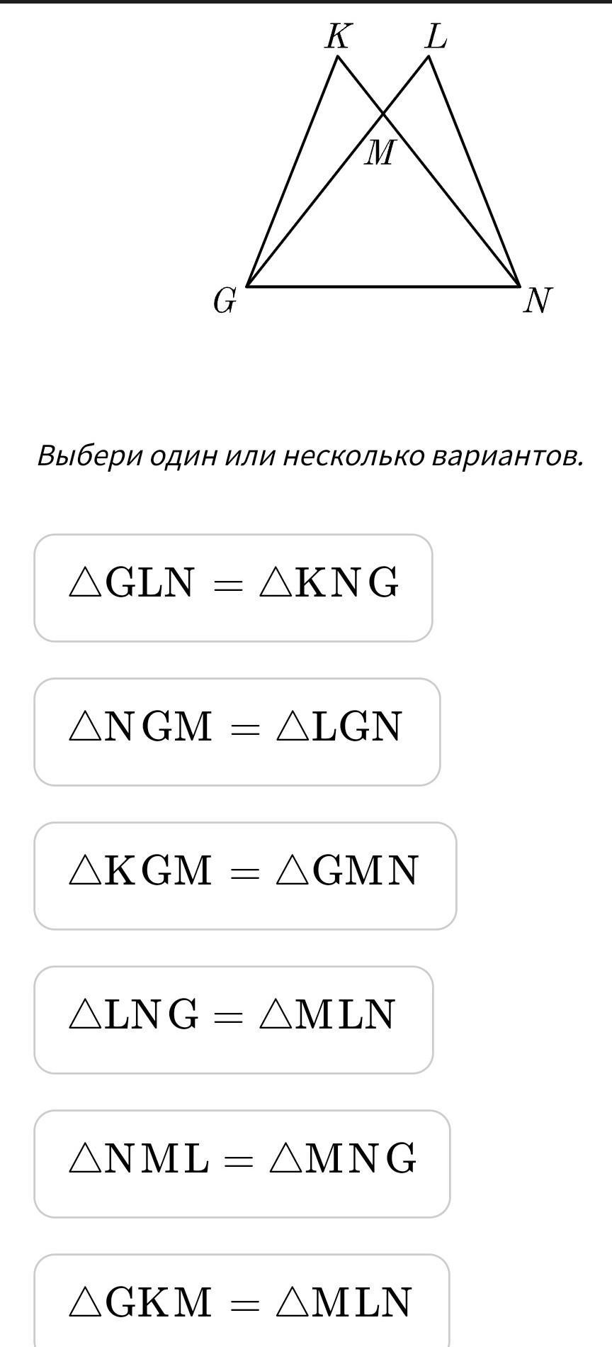 Выбери равные треугольники, если KG=LN, KM=ML и ∠GKN=∠GLN